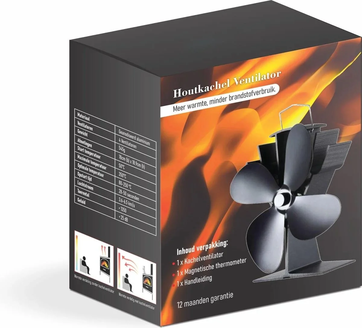 Dankzij de kachelventilator wordt uw heerlijke kachelwarmte direct horizontaal uw kamer in verspreid, in plaats van dat deze naar het plafond stijgt, rondom de kachel blijft hangen of direct via de schoorsteen het huis verlaat. De kachelventilator is geheel geluidloos en functioneert zonder batterijen, geleverd met luxe magnetische thermometer waarmee u gemakkelijk en precies de temperatuur van uw kachel kunt aflezen. Geen montage nodig: uit de verpakking, op de kachel neerzetten en de houtkachelventilator doet zijn werk. Zeer comfort vergrotend, energiebesparend én geschikt voor vrijwel alle kachels!
