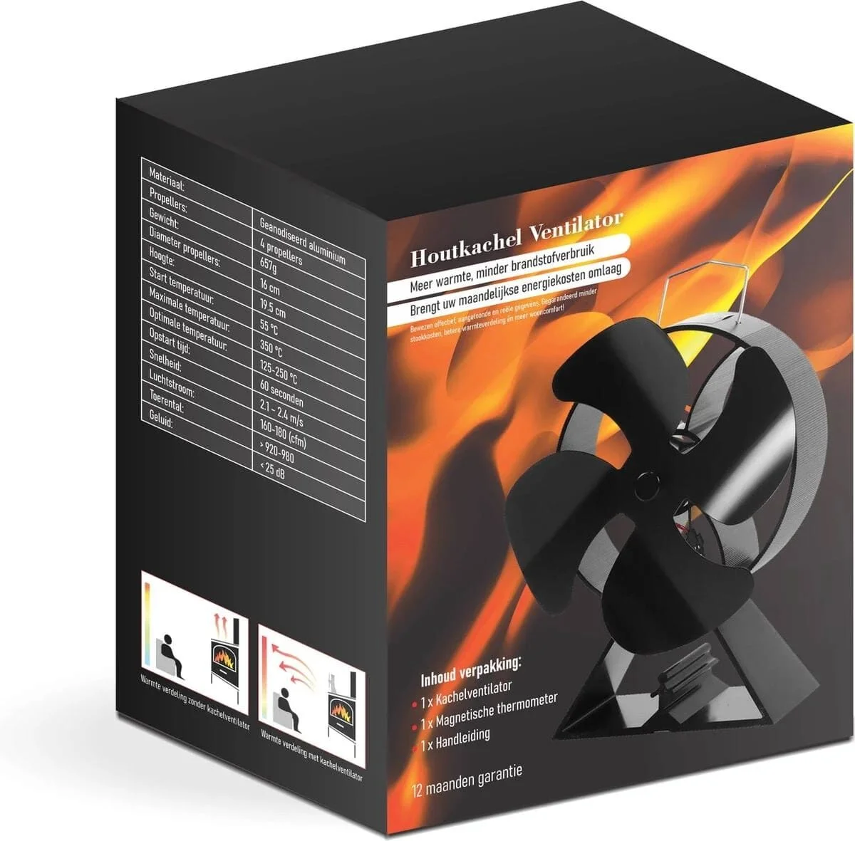 Dankzij de kachelventilator wordt uw heerlijke kachelwarmte direct horizontaal uw kamer in verspreid, in plaats van dat deze naar het plafond stijgt, rondom de kachel blijft hangen of direct via de schoorsteen het huis verlaat. De kachelventilator is geheel geluidloos en functioneert zonder batterijen, geleverd met luxe magnetische thermometer waarmee u gemakkelijk en precies de temperatuur van uw kachel kunt aflezen. Geen montage nodig: uit de verpakking, op de kachel neerzetten en de houtkachelventilator doet zijn werk. Zeer comfort vergrotend, energiebesparend én geschikt voor vrijwel alle kachels!